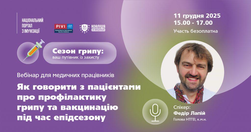 Запрошуємо медичних працівників на безоплатний вебінар “Як говорити з пацієнтами про профілактику грипу та вакцинацію під час епідсезону” 11 грудня з 15.00 до 17.00 на платформі Національного порталу з імунізації. Спікер – голова НТГЕІ, к.м.н., лікар-дитячий інфекціоніст Федір Лапій.